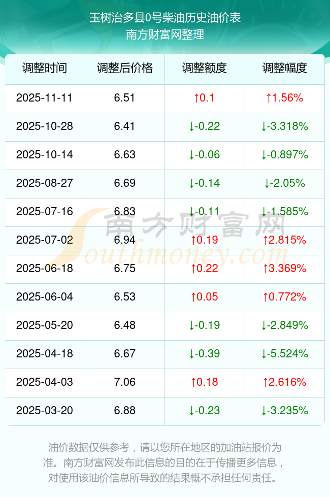 11月19日玉树治多县汽油、柴油价格是11月11日调整后的价格,每升价格具体为:92号汽油为6.9元,上调了0.1元,上调幅达1.47%;95号汽油为7.39元,上调了0.1元,上调幅达1.37%;89号汽油为6.47元,上调了0.09元,上调幅达1.41%;0号柴油为6.51元,上调了0.1元,上调幅达1.56%。