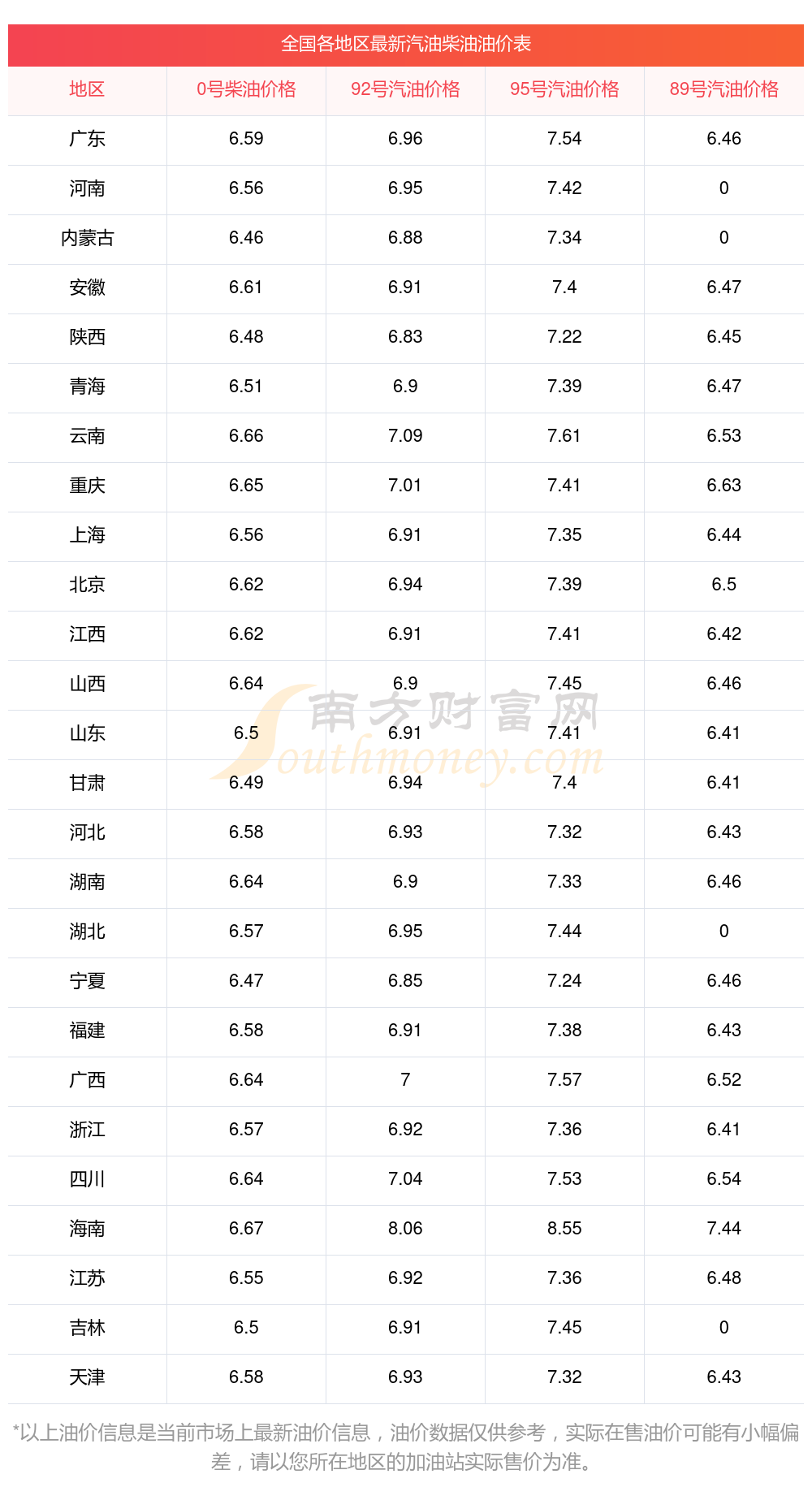 附:最新全国汽油、柴油价格一览表