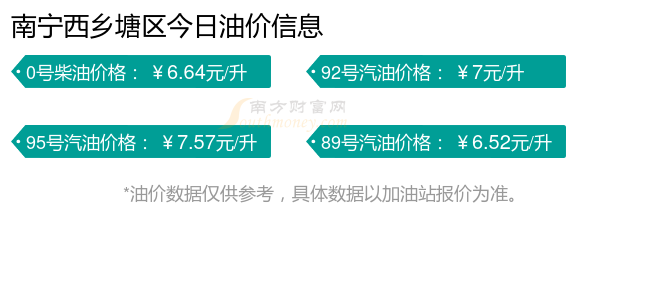 南宁西乡塘区汽油、柴油11月19日每升的价格为(本轮油价调整时间为11月11日):92号汽油7元;95号汽油7.57元;89号汽油6.52元;0号柴油6.64元。
