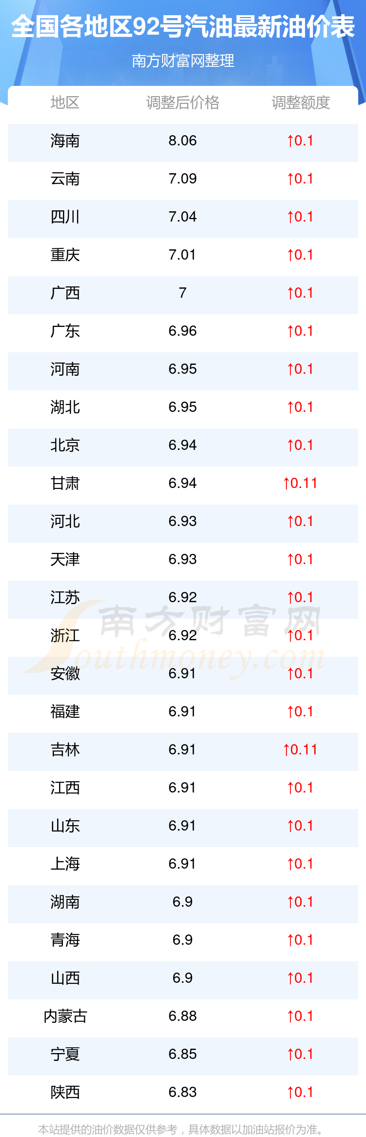 以上数据仅供参考,请以您所在地区的加油站实际售价为准。开云手机web版登录入口发布此信息的目的在于传播更多信息,对使用该油价信息所导致的结果概不承担责任。