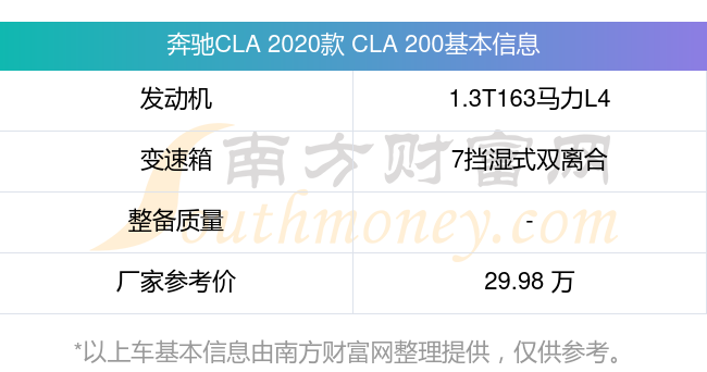 在动力上,奔驰CLA 2020款 CLA 200配备的是一台1.3T163马力L4涡轮增压发动机,匹配的是7挡湿式双离合自动档变速箱,燃料形式为汽油,厂家参考价29.98万元。