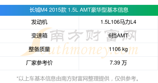 在动力上,长城M4 2015款 1.5L AMT豪华型配备的是一台1.5L106马力L4自然吸气发动机,匹配的是6挡AMT自动档变速箱,燃料形式为汽油,常规整备质量1106kg,厂家参考价7.39万元。