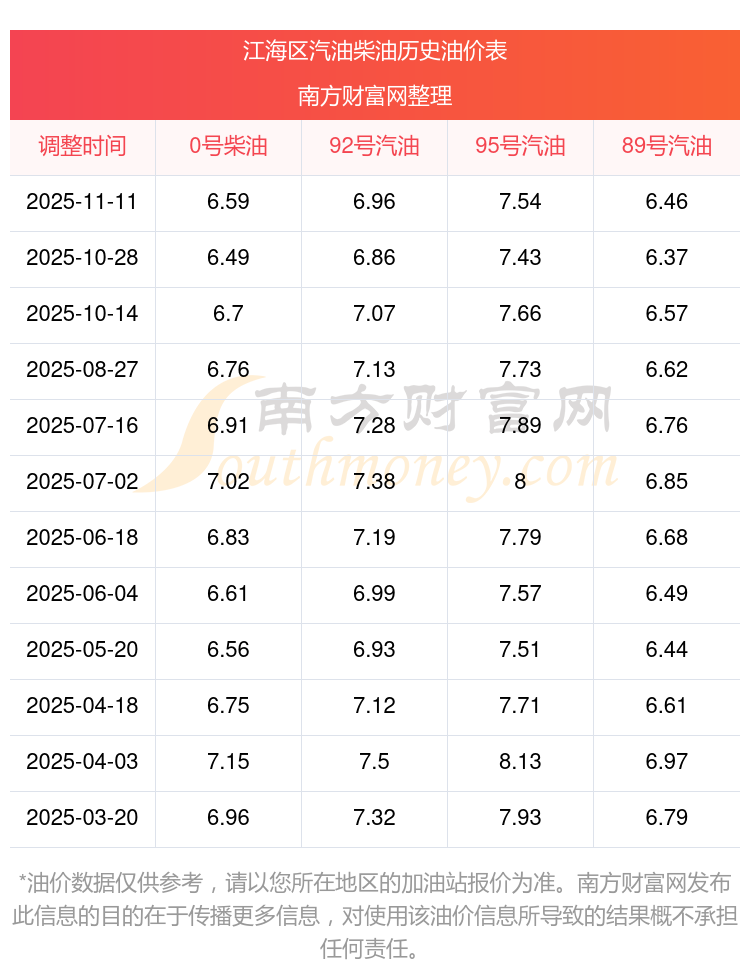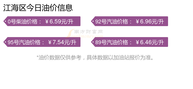 江海区汽油、柴油11月19日每升的价格是多少?11月11日调整后的价格详情如下:92号汽油6.96元;95号汽油7.54元;89号汽油6.46元;0号柴油6.59元。