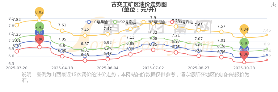 11月19日古交工矿区汽油、柴油每升的价格是多少?详情如下:95号汽油为7.45元,上升了0.11元;92号汽油为6.9元,上升了0.1元;89号汽油为6.46元,上升了0.1元;0号柴油为6.64元,上升了0.1元,调整时间为11月11日。
