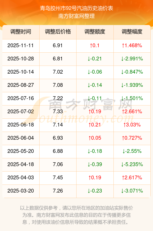 11月19日青岛胶州市92号汽油历史油价调整一览表