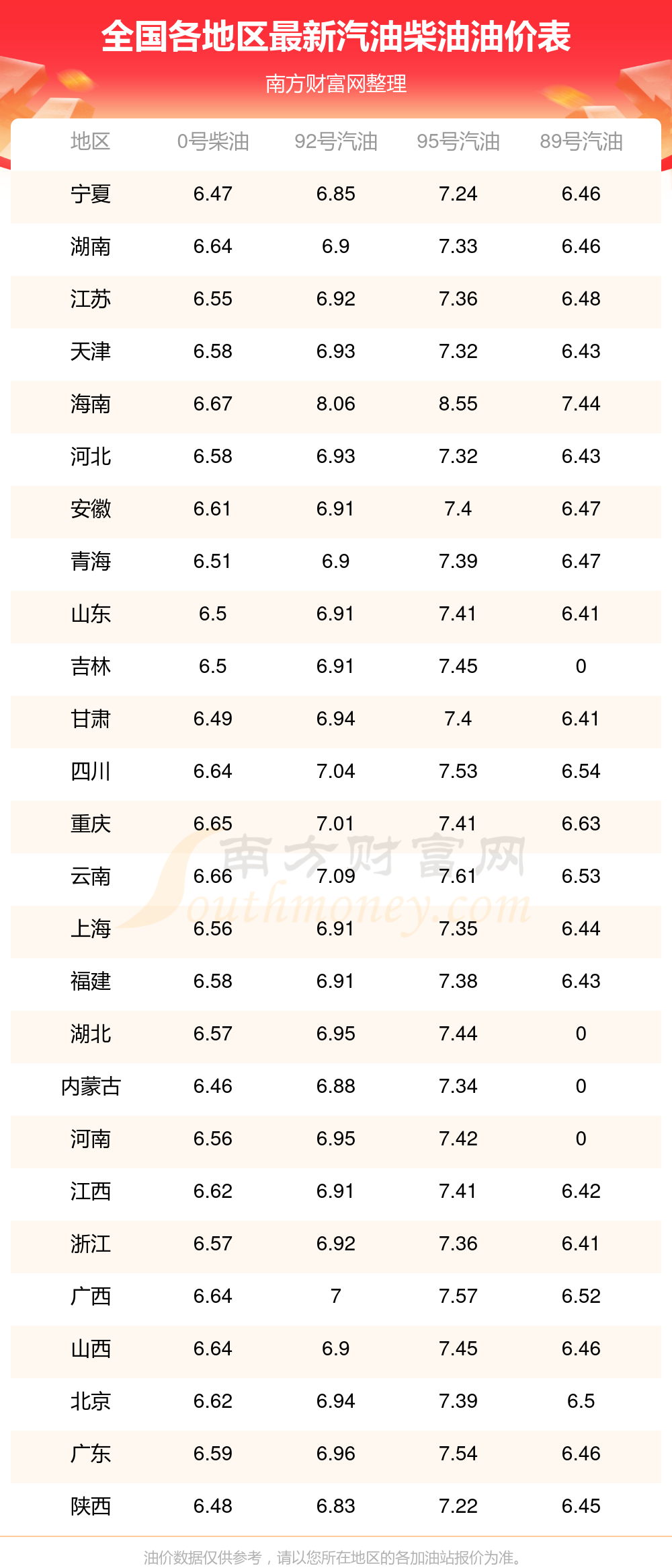 油价最新调整时间为11月11日 ,全国92号汽油最新平均价格为:7元每升,其中,最高为海南,价格为8.06元/升,最低为陕西,价格为6.83元/升。全国95号汽油最新平均价格为:7元每升,其中,最高为海南,价格为8.55元/升,最低为陕西,价格为7.22元/升。全国0号柴油最新平均价格为:7元每升,其中,最高为海南,价格为6.67元/升,最低为内蒙古,价格为6.46元/升。全国89号汽油最新平均价格为:7元每升,其中,最高为海南,价格为7.44元/升,最低为浙江,价格为6.41元/升。下一轮油价调整时间11月24日24时,距离现在还有5.11天。