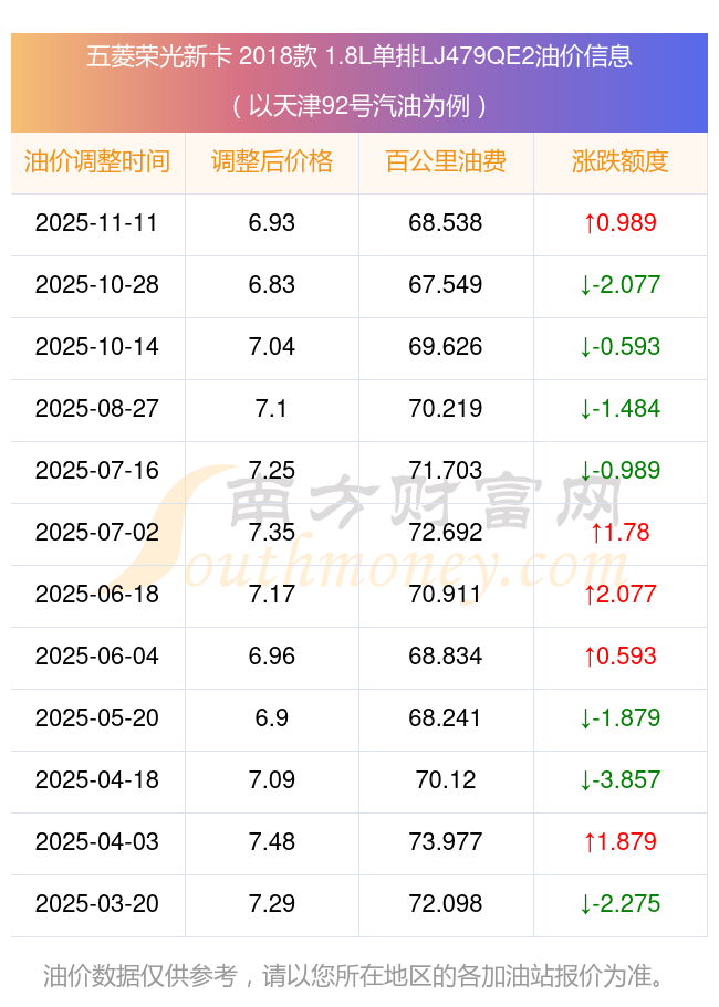 按11月11日92号汽油最新调整价格6.93元每升来计算(以天津为例),该车型百公里平均油费为68.538元,按上一轮10月28日调整价格6.83元每升来计算,百公里平均油费为67.549元,对比上一轮多花0.989元,下一轮油价调整时间为11月24日24时。