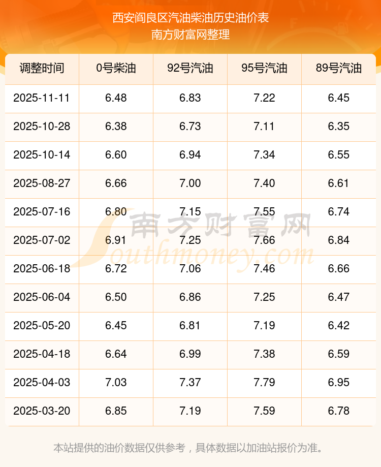 11月19日西安阎良区汽油、柴油价格是多少钱一升?11月11日油价调整后,每升油价为:92号汽油为6.83元,升了0.1元,升幅达1.49%;95号汽油为7.22元,升了0.11元,升幅达1.55%;89号汽油为6.45元,升了0.1元,升幅达1.58%;0号柴油为6.48元,升了0.1元,升幅达1.57%。