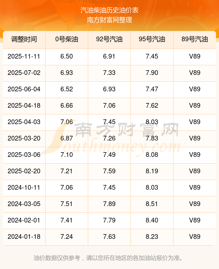 11月19日,通化95号汽油最新价格为7.45元/升,调整时间为11月11日,相对上次调整上调了0.11元。下一轮油价调整时间11月24日24时,距离现在还有5.09天。