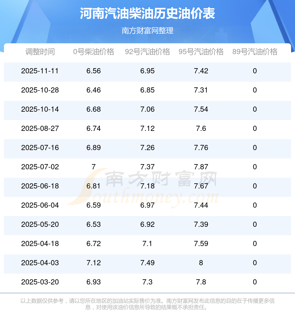 11月19日河南汽油、柴油的价格为11月11日调整后的价格。每升最新价格为:92号汽油6.95元,上调了0.1元;95号汽油7.42元,上调了0.11元;0号柴油6.56元,上调了0.1元。