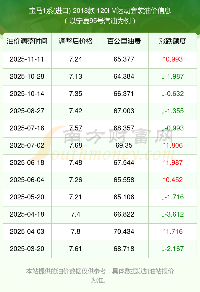 根据11月11日95号汽油最新调整价格7.24元/升来计算(以宁夏为例),该车型每百公里的平均油费是65.377元,上一轮10月28日调整价格7.13元每升来计算,每百公里的平均油费是64.384元,对比上一轮多花0.993元,下一轮的油价调整时间是11月24日24时。
