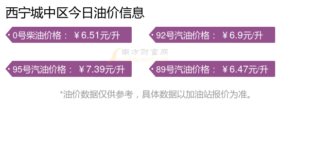 西宁城中区汽油、柴油11月19日每升最新价格为:95号汽油为7.39元,上升了0.1元;92号汽油为6.9元,上升了0.1元;89号汽油为6.47元,上升了0.09元;0号柴油为6.51元,上升了0.1元,调整时间为11月11日。下一轮油价调整时间11月24日24时。