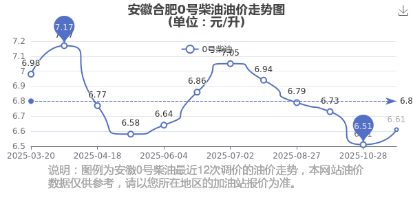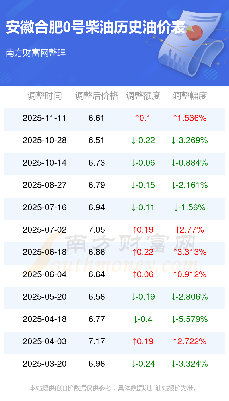 安徽合肥0号柴油11月19日最新价格为6.61元/升,调整时间为11月11日,相对上次调整时间10月28日的油价6.51元每升,增了0.1元,增1.536%。