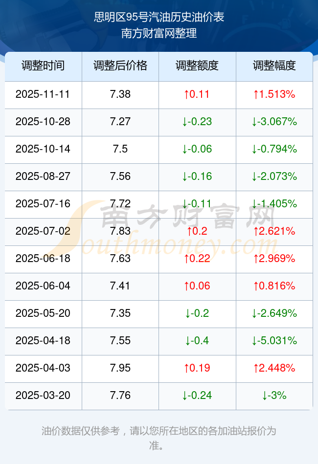 11月19日思明区95号汽油的价格是7.38元/升(调整时间为11月11日),对比上次调整时间10月28日的油价7.27元/升,增了0.11元,增幅达1.513%。