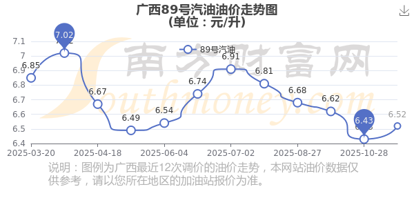 11月20日,广西89号汽油的价格是6.52元每升,本次的调整时间为11月11日,对比上次的调整上升了0.09元,上升1.4%,11月24日24时为下一轮油价调整时间,还有4.89天。
