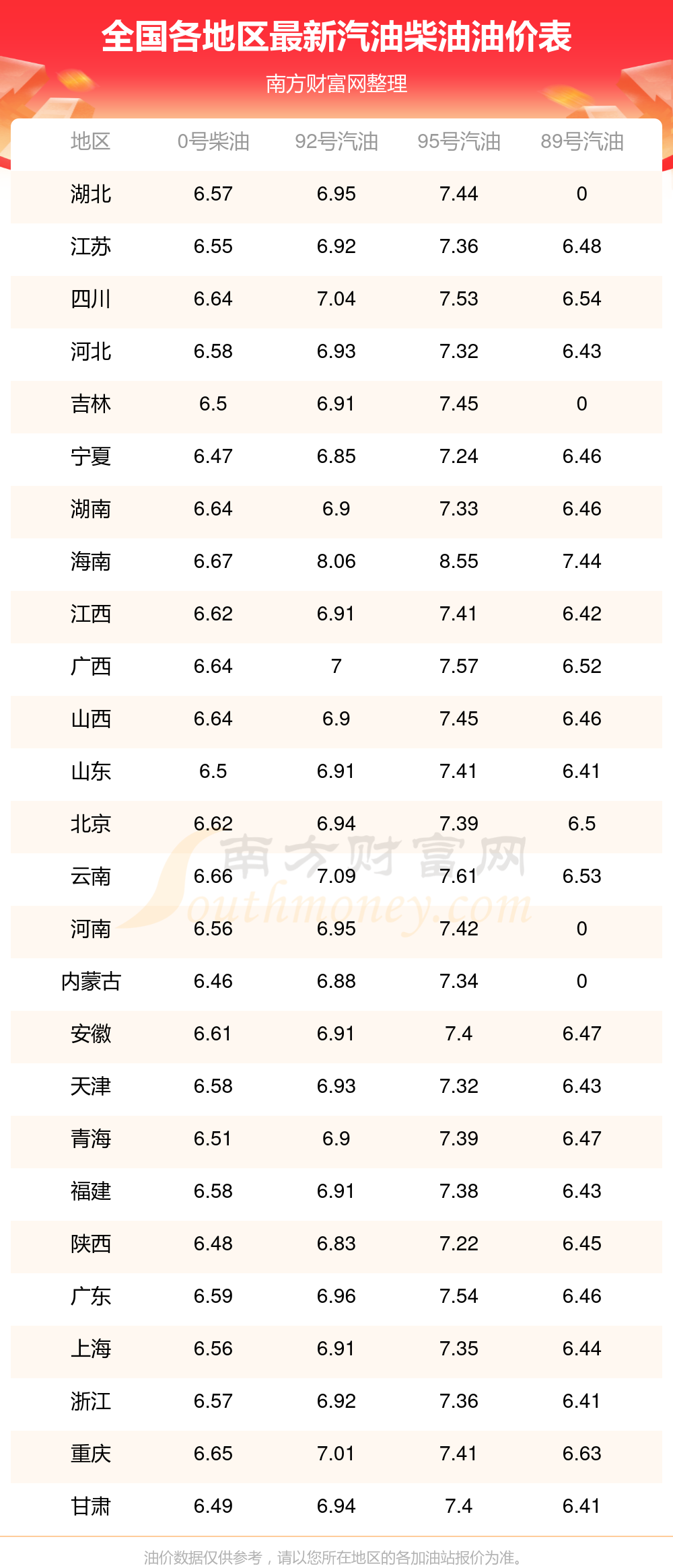 2025年11月20日全国各地油价调整及最新汽油价格表