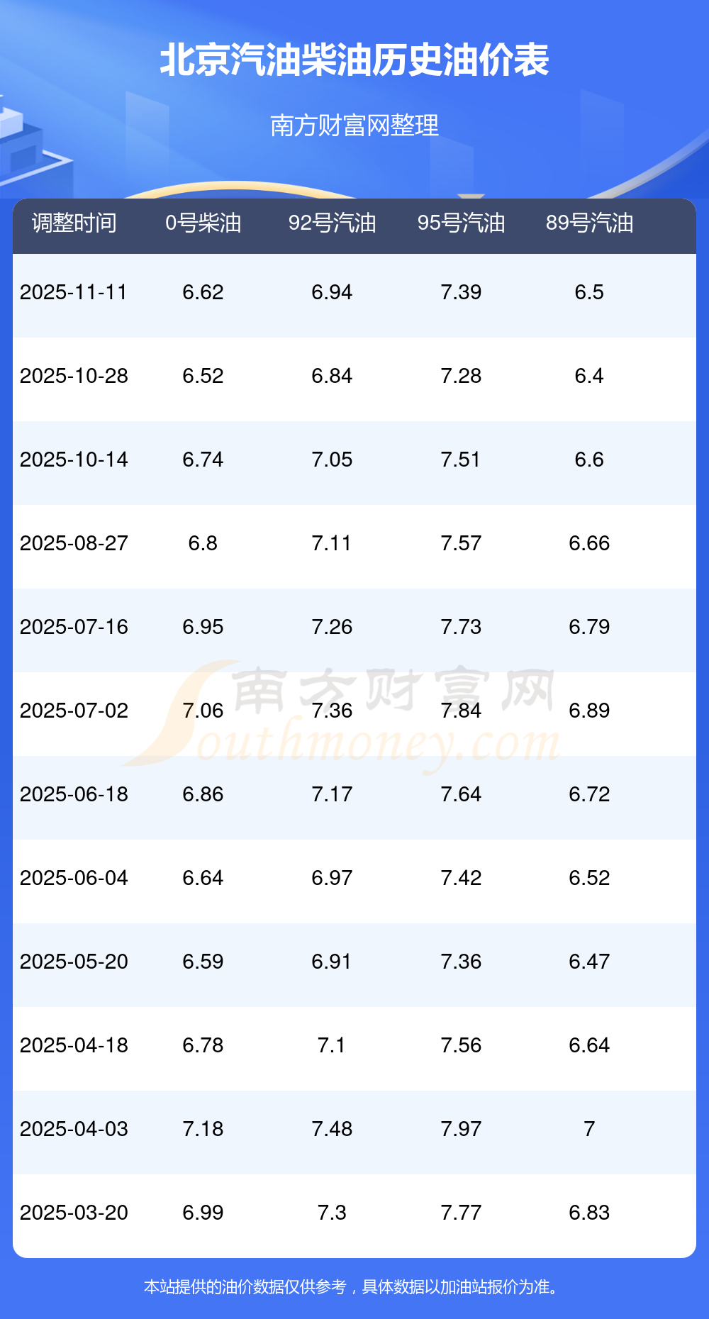 11月20日,北京汽油、柴油价格的调整时间为11月11日。每升最新价格为:92号汽油为6.94元,升了0.1元;95号汽油为7.39元,升了0.11元;89号汽油为6.5元,升了0.1;0号柴油为6.62元,升了0.1元。