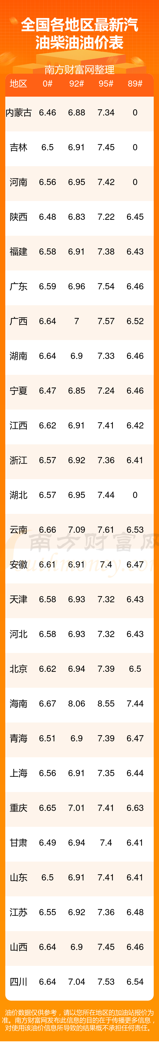 汽油价格调整最新消息:下一轮油价调整11月24日24时开启。本轮油价的调整时间为11月11日,调整后全国92号汽油平均价格为7元每升,其中,最低为陕西的6.83元/升,最高为海南的8.06元/升。全国95号汽油平均价格为7元每升,其中,最低为陕西的7.22元/升,最高为海南的8.55元/升。全国0号柴油平均价格为:7元每升,其中,最低为内蒙古的6.46元/升,最高为海南的6.67元/升。全国89号汽油平均价格为7元每升,其中,最低为浙江的6.41元/升,最高为海南的7.44元/升。
