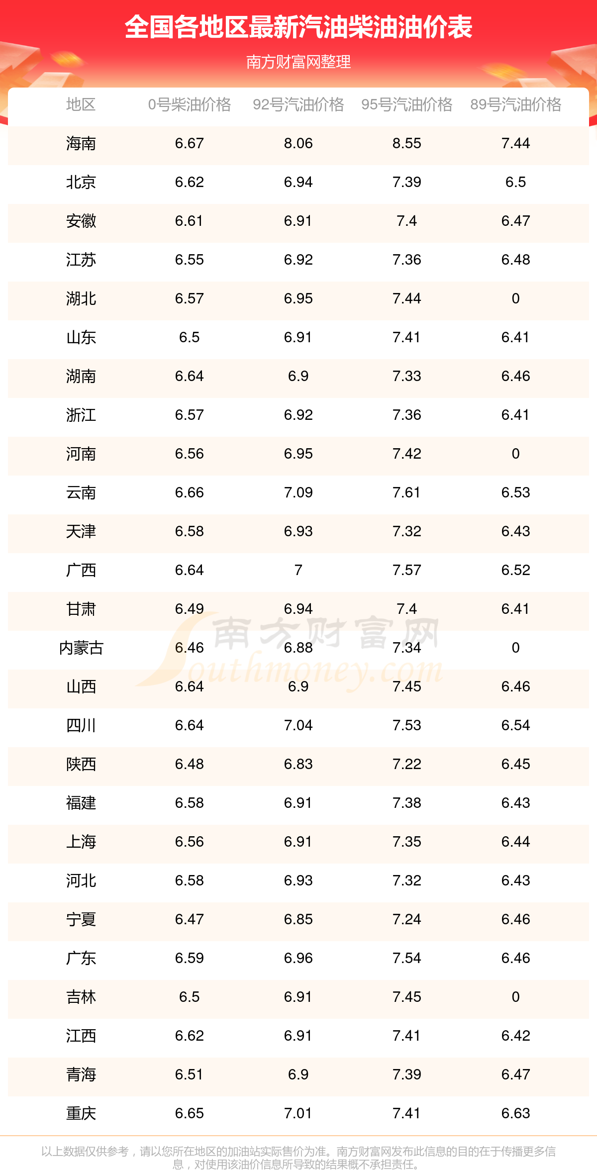 全国0号柴油平均价格为:7元每升,其中,最低为内蒙古,价格6.46元/升,最高为海南,价格6.67元/升。