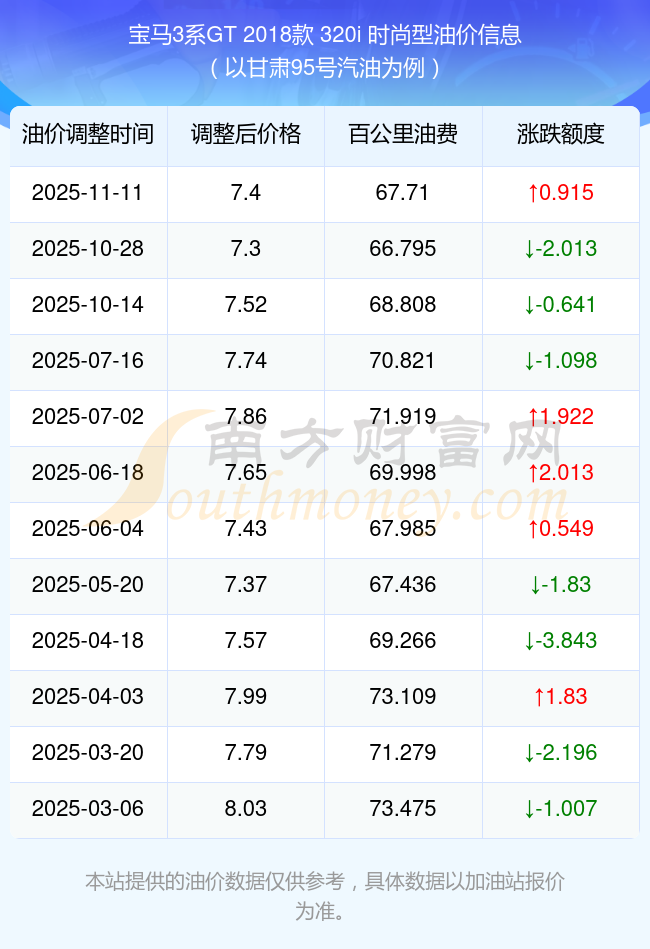 按照11月11日95号汽油最新调整价格7.4元/升来计算(以甘肃为例),该车型百公里平均油费为67.71元,按照上一轮10月28日调整价格7.3元/升来计算,百公里平均油费为66.795元,对比上一轮多花0.915元,下一轮油价调整时间为11月24日24时。