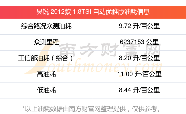 根据车主实测数据,该车型低油耗为8.44升/百公里,高油耗为11.00升/百公里,综合路况众测油耗为9.72升/百公里,工信部综合油耗为8.20升/百公里。