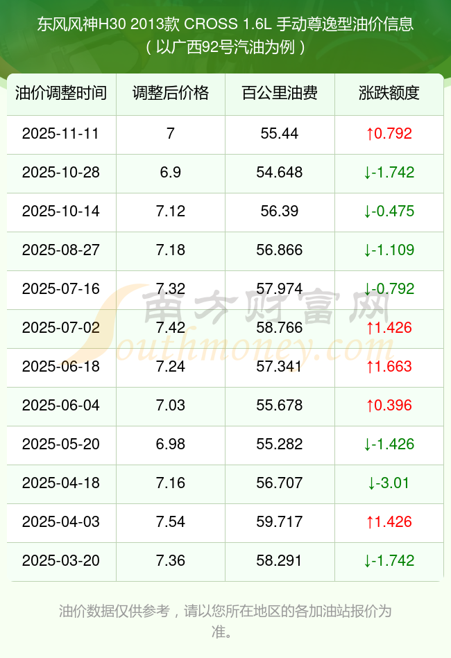 按11月11日92号汽油最新调整价格7元每升来计算(以广西为例),该车型百公里平均油费为55.44元,按上一轮10月28日调整价格6.9元每升来计算,百公里平均油费为54.648元,对比上一轮多花0.792元,下一轮油价调整时间为11月24日24时。