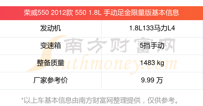 荣威550 2012款 550 1.8L 手动足金限量版动力上搭载的是一台1.8L133马力L4自然吸气发动机,匹配5挡手动挡变速箱,燃料形式为汽油,常规整备质量1483kg,厂家参考价9.99万元。