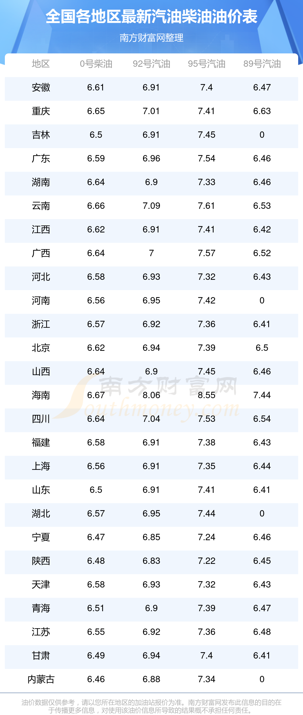 全国各地区最新汽油价格表