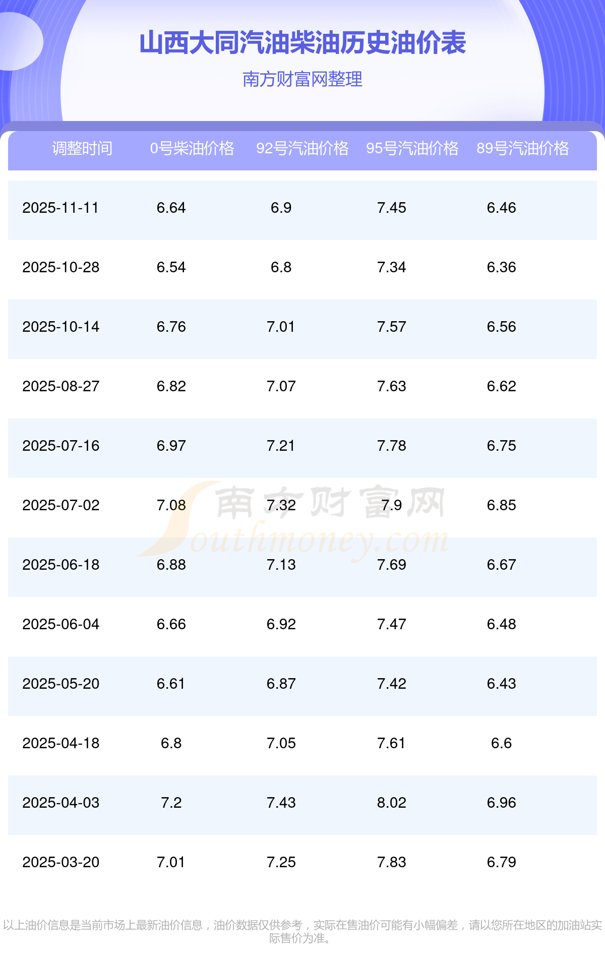 11月20日山西大同汽油、柴油价格是多少钱一升?11月11日油价调整后,每升油价为:92号汽油为6.9元,上升了0.1元,上升幅达1.47%;95号汽油为7.45元,上升了0.11元,上升幅达1.5%;89号汽油为6.46元,上升了0.1元,上升幅达1.57%;0号柴油为6.64元,上升了0.1元,上升幅达1.53%。
