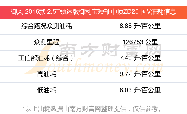 根据车主实测数据,该车型低油耗为8.03L/100km,高油耗为9.72L/100km,综合路况众测油耗为8.88L/100km,工信部综合油耗为7.40L/100km。