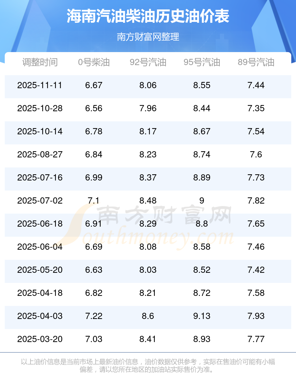 (11月20日)92、95号汽油价格一览表