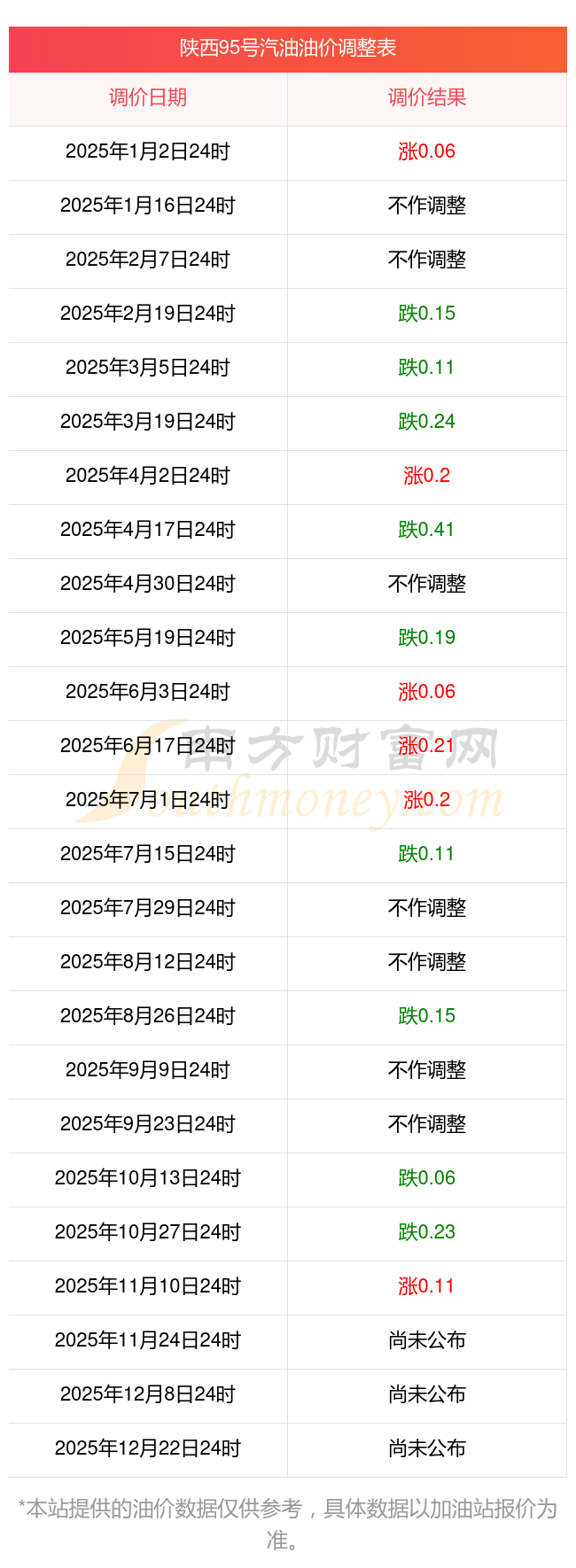 11月20日,陕西95号汽油的价格是7.22元每升,本次的调整时间为11月11日,对比上次的调整升了0.11元,升1.547%,下次调整时间为11月24日24时,还有4.7天。