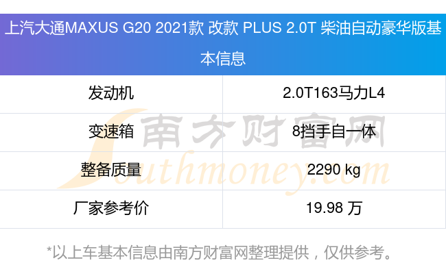 在动力上,上汽大通MAXUS G20 2021款 改款 PLUS 2.0T 柴油自动豪华版配备的是一台2.0T163马力L4涡轮增压发动机,匹配的是8挡手自一体自动档变速箱,燃料形式为柴油,常规整备质量2290kg,厂家参考价19.98万元。