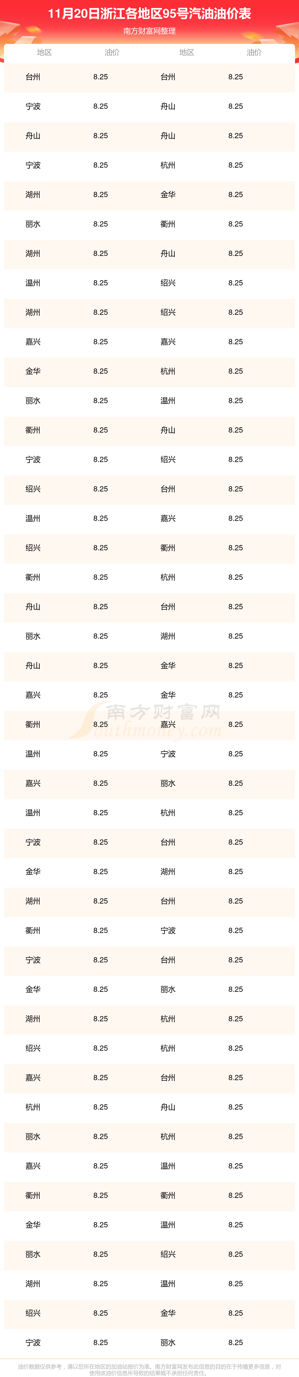 11月20日,浙江95号汽油的价格是7.36元每升,本次的调整时间为11月11日,对比上次的调整上涨了0.11元,上涨1.517%,11月24日24时为下一轮油价调整时间,还有4.66天。