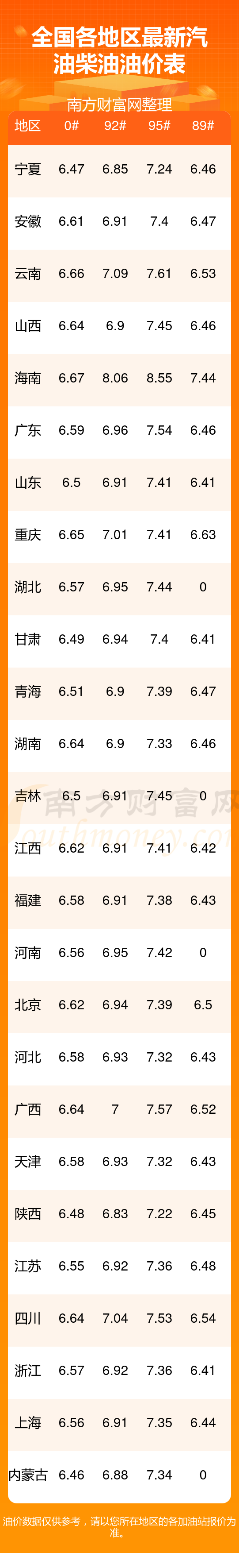 以上数据仅供参考,请以您所在地区的加油站实际售价为准。开云手机web版登录入口发布此信息的目的在于传播更多信息,对使用该油价信息所导致的结果概不承担责任。