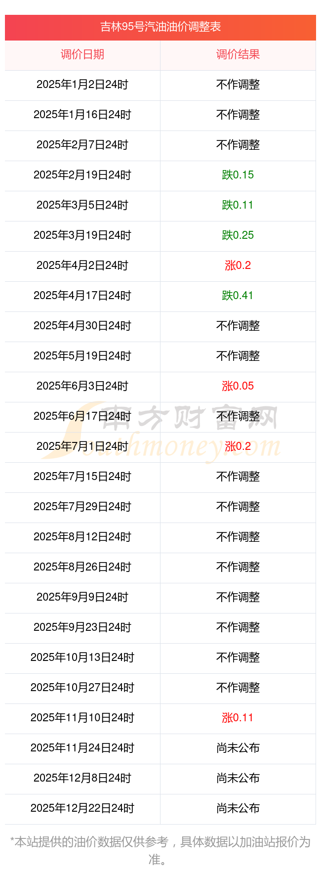 11月20日,吉林95号汽油的价格是7.45元每升,本次的调整时间为11月11日,对比上次的调整升了0.11元,升1.499%,11月24日24时为下一轮油价调整时间,还有4.64天。