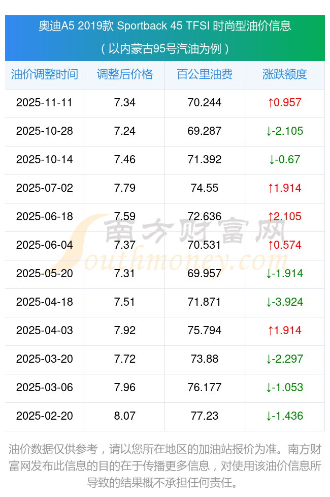 根据11月11日95号汽油最新调整价格7.34元/升来计算(以内蒙古为例),该车型每百公里的平均油费是70.244元,上一轮10月28日调整价格7.24元每升来计算,每百公里的平均油费是69.287元,对比上一轮多花0.957元,下一轮的油价调整时间是11月24日24时。