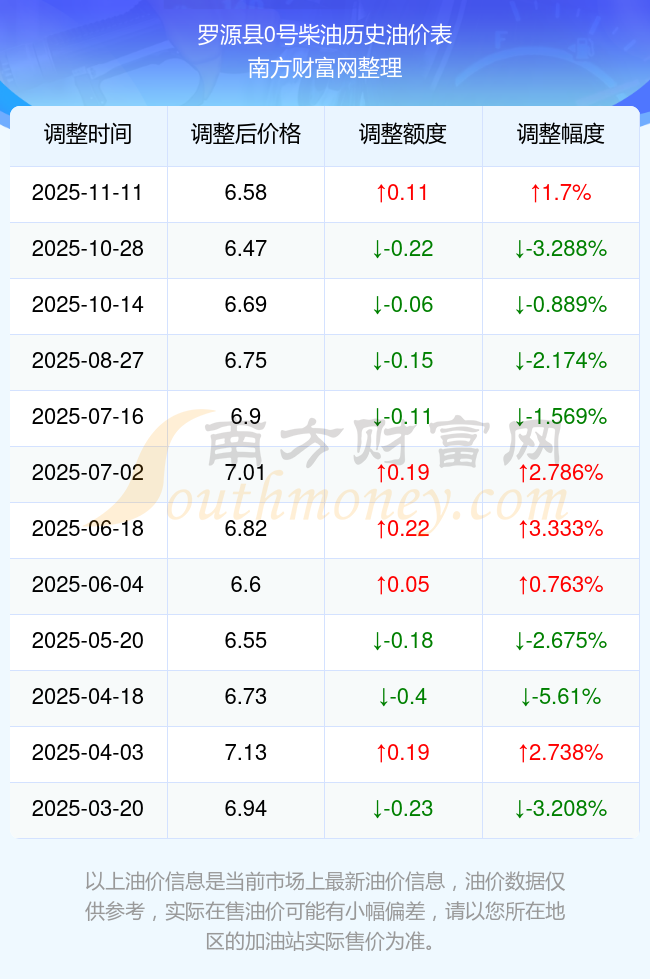 11月20日罗源县0号柴油的最新价格:罗源县0号柴油6.58元/升(根据11月11日调整后的价格),相对上次调整时间10月28日的油价6.47元每升,上升了0.11元,上升1.7%。
