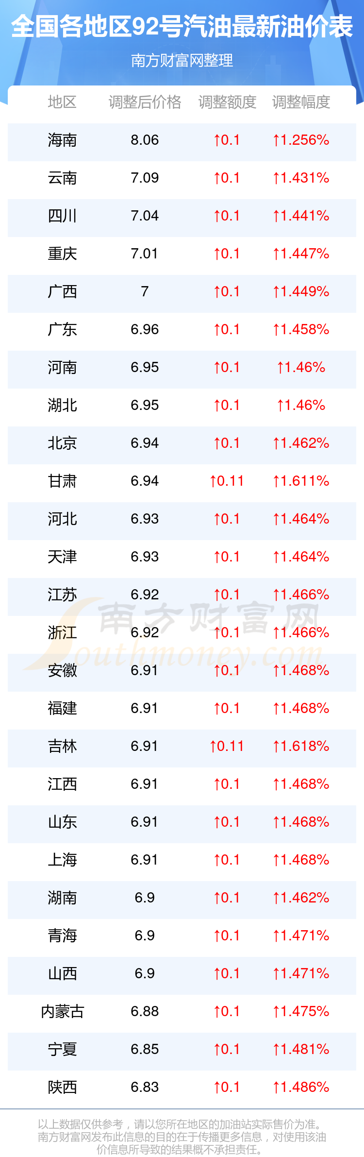 以上油价信息是当前市场上最新油价信息,油价数据仅供参考,实际在售油价可能有小幅偏差,请以您所在地区的加油站实际售价为准。