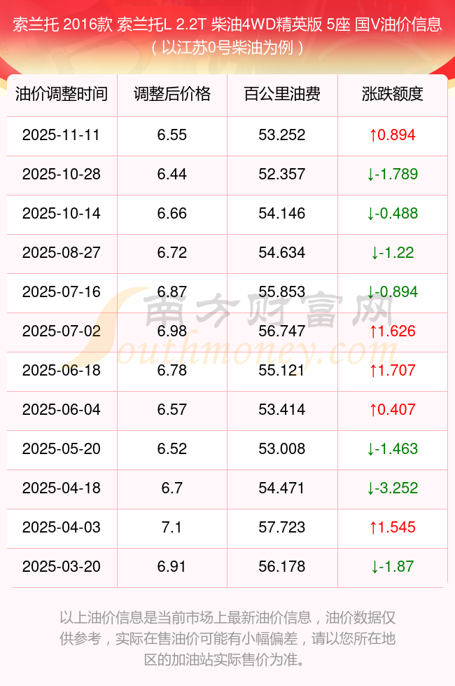 按照11月11日0号柴油最新调整价格6.55元/升来计算(以江苏为例),该车型百公里平均油费为53.252元,按照上一轮10月28日调整价格6.44元/升来计算,百公里平均油费为52.357元,对比上一轮多花0.894元,下一轮油价调整时间为11月24日24时。