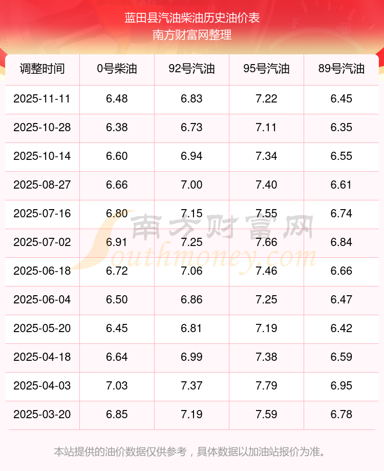 11月20日蓝田县汽油每升的价格为11月11日调整后的价格,具体价格如下:92号汽油6.83元;95号汽油7.22元;89号汽油6.45元;0号柴油6.48元。