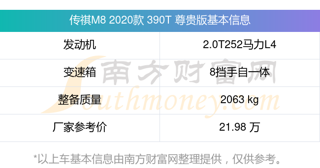在动力上,传祺M8 2020款 390T 尊贵版配备的是一台2.0T252马力L4涡轮增压发动机,匹配的是8挡手自一体自动档变速箱,燃料形式为汽油,常规整备质量2063kg,厂家参考价21.98万元。