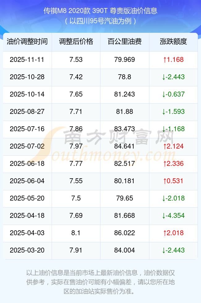 按照11月11日95号汽油最新调整价格7.53元/升来计算(以四川为例),该车型百公里平均油费为79.969元,按照上一轮10月28日调整价格7.42元/升来计算,百公里平均油费为78.8元,对比上一轮多花1.168元,下一轮油价调整时间为11月24日24时。