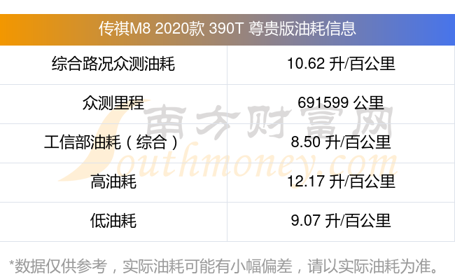 根据多位车主实测得出数据,该车型低油耗为9.07L/100km,高油耗为12.17L/100km,综合路况众测油耗为10.62L/100km,工信部综合油耗为8.50L/100km。