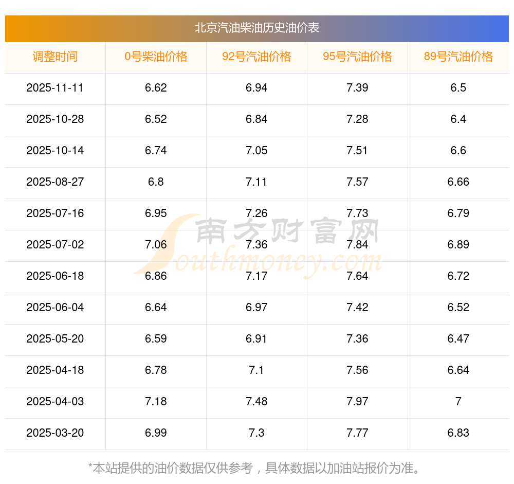 北京2025年最新汽油柴油历史油价表