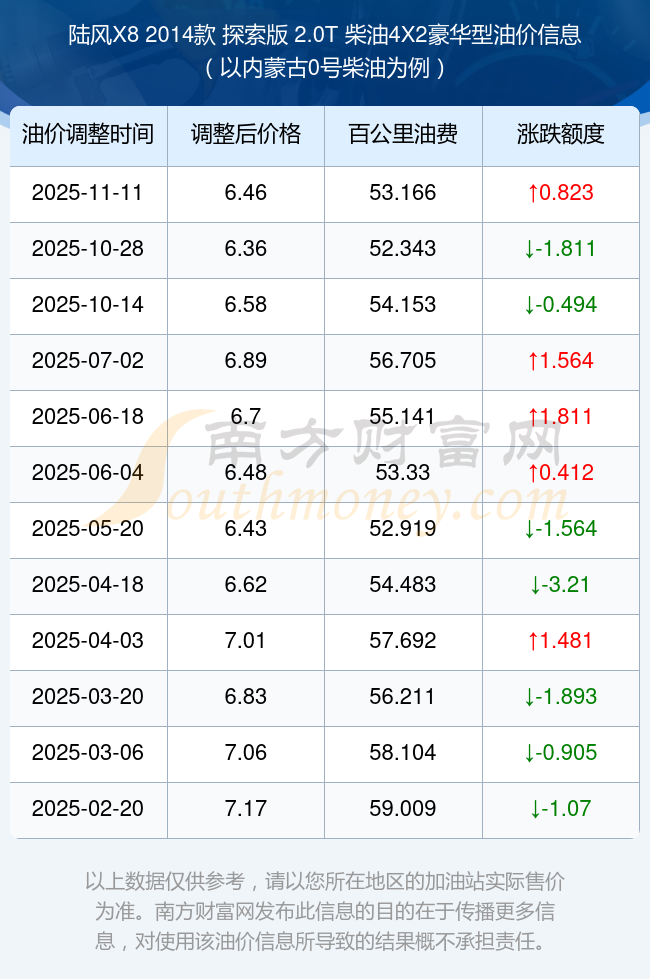 按照11月11日0号柴油最新调整价格6.46元/升来计算(以内蒙古为例),该车型百公里平均油费为53.166元,按照上一轮10月28日调整价格6.36元/升来计算,百公里平均油费为52.343元,对比上一轮多花0.823元,下一轮油价调整时间为11月24日24时。