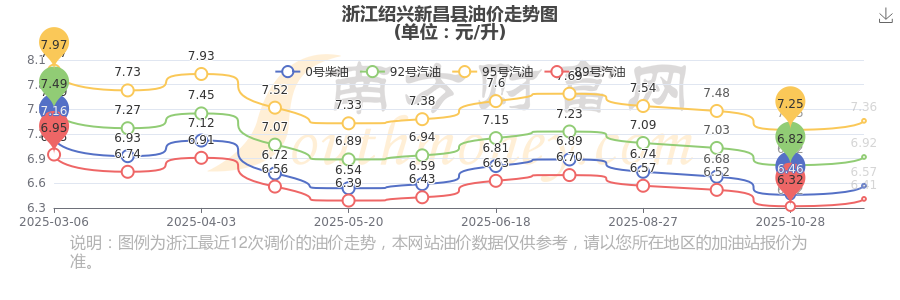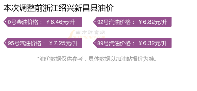 浙江绍兴新昌县汽油、柴油11月20日每升的价格是多少?具体为:92号汽油为6.92元,上涨了0.1元;95号汽油为7.36元,上涨了0.11元;89号汽油为6.41元,上涨了0.09元;0号柴油为6.57元,上涨了0.11元,本轮油价的调整时间为11月11日。