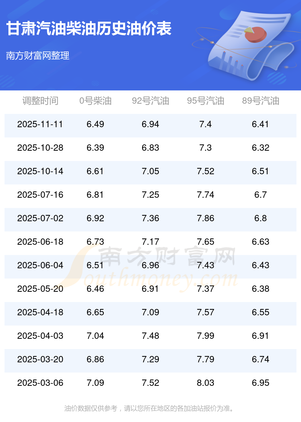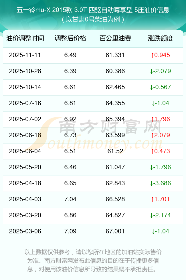 按11月11日0号柴油最新调整价格6.49元每升来计算(以甘肃为例),该车型百公里平均油费为61.331元,按上一轮10月28日调整价格6.39元每升来计算,百公里平均油费为60.386元,对比上一轮多花0.945元,下一轮油价调整时间为11月24日24时。