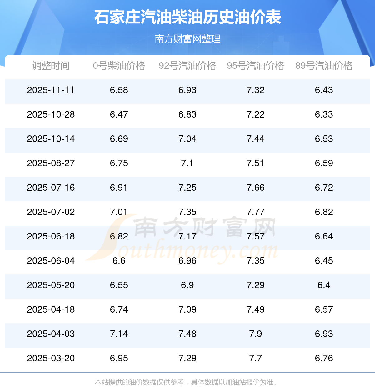 11月20日石家庄汽油柴最新油价是多少?具体每升为:11月11日调整后,92号汽油为6.93元,上涨了0.1元,上涨幅达1.46%;95号汽油为7.32元,上涨了0.1元,上涨幅达1.39%;89号汽油为6.43元,上涨了0.1元,上涨幅达1.58%;0号柴油为6.58元,上涨了0.11元,上涨幅达1.7%。