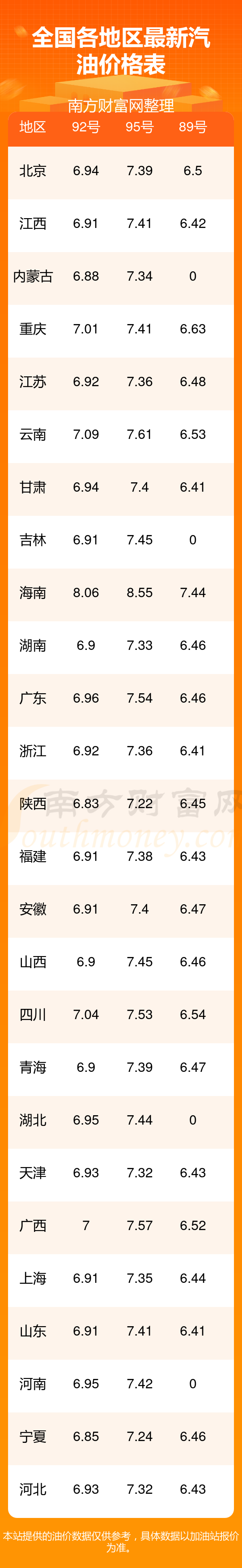 以上油价信息是当前市场上最新油价信息,油价数据仅供参考,实际在售油价可能有小幅偏差,请以您所在地区的加油站实际售价为准。